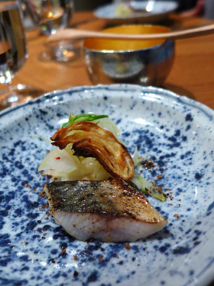 Photos : 1 : La salle du restaurant - 2 : Les Saint-Jacques d'Erquy avec chou fleur en fine croûte et tartufi di Alba - 3 : Les lentilles vertes du Puy avec caviar doré dans une délicate gelée - 4 : Le Bar de l'Atlantique - 5 : Les agrumes de Michel Bachès en amertume et granité Amaro.