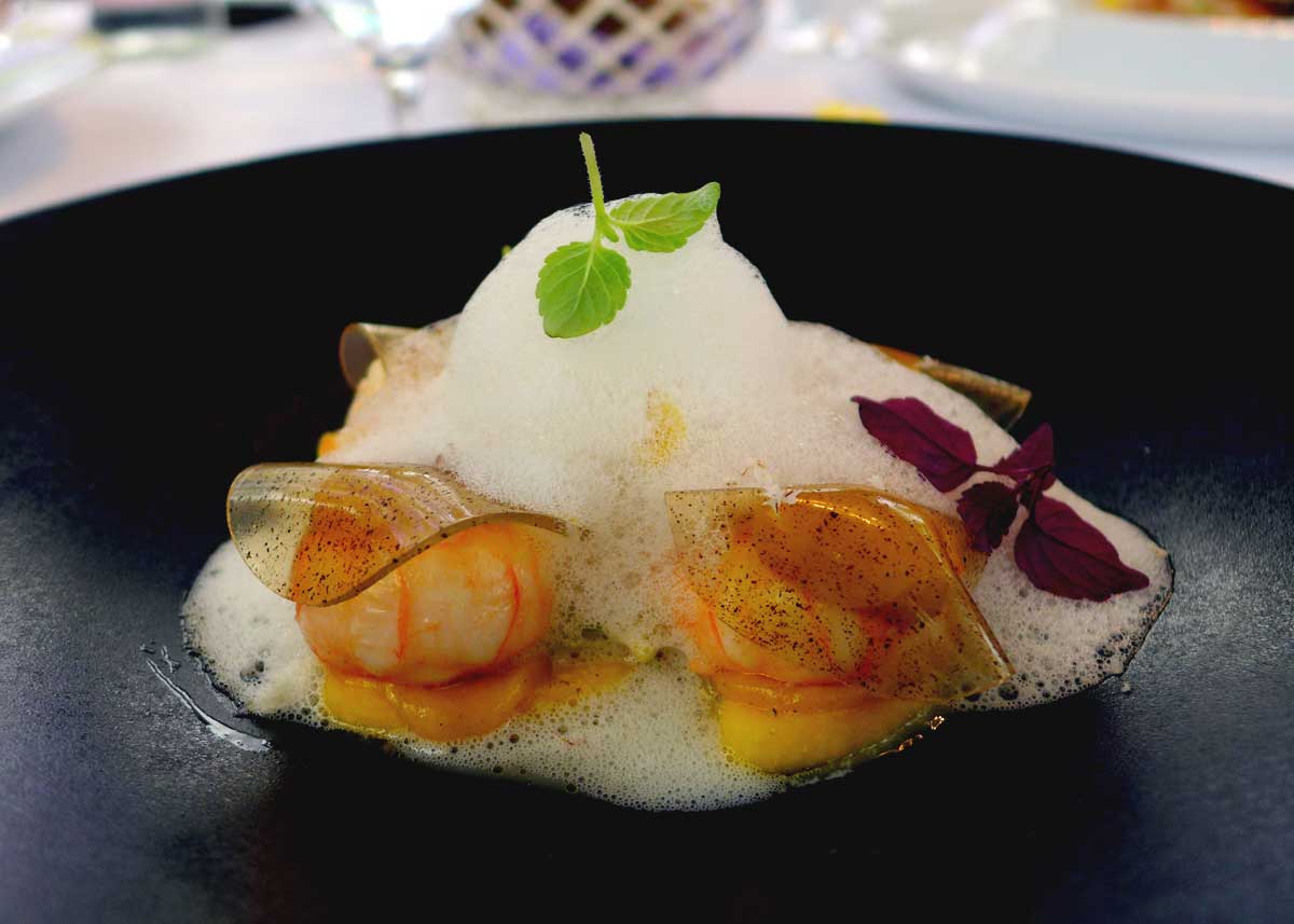 Photos : 1 : La Cour de Marbre - 2 : L'oeuf de poule fumé au caviar avec cresson de fontaine et salicorne - 3 : Le homard bleu en salade d'épinard et petits pois - 4 : Les langoustines rôties à la feuille de combawa avec mangue et coco lime - 5 : La fraise ciflorette au balsamique blanc avec chantilly pistache et sorbet yaourt.