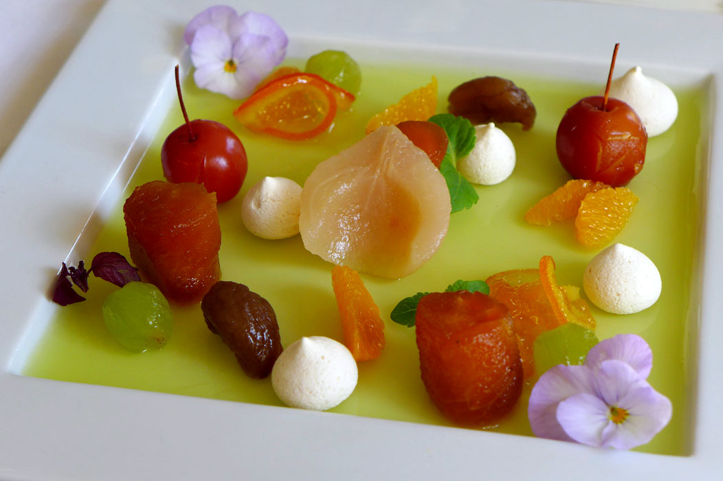 Pour le dessert, la soupe de chocolat avec profiteroles churros et poires, le soufflé chaud La Vatrouchka et crème glacée aux canneberges toujours apprécié, ou le magnifique Kyscielli de fruits de saison : châtaignes-pommes-poires-mandarines.