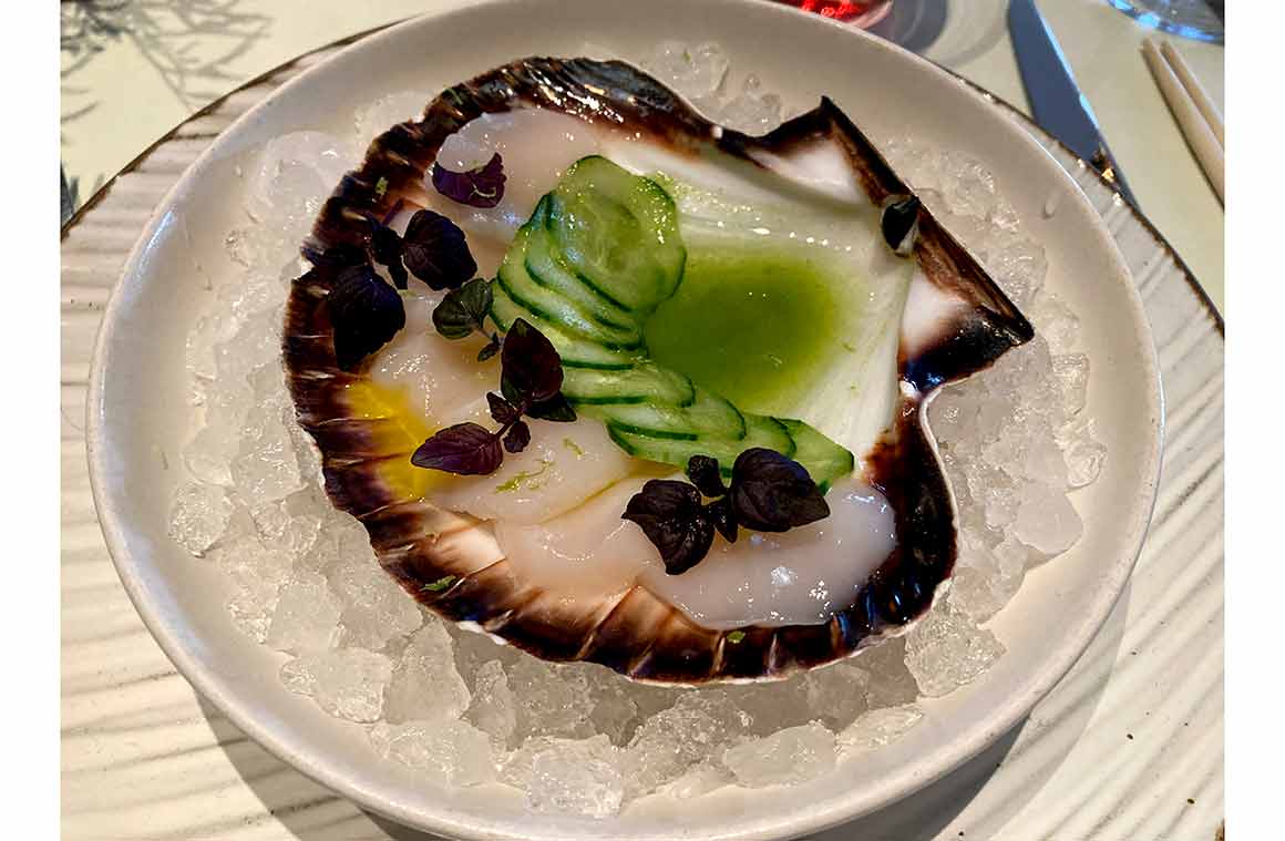 - Saint-Jacques crues dans la coquille, concombre mariné au kombu et citron vert