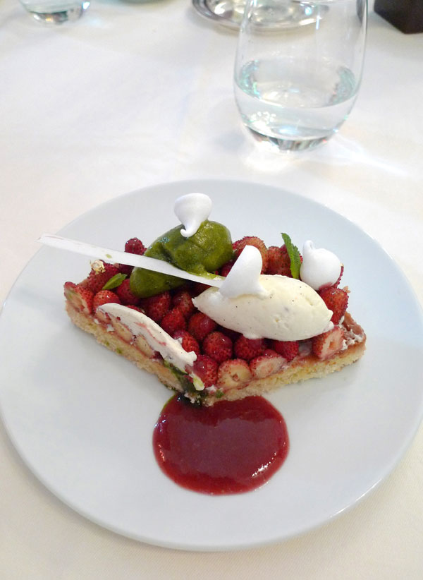 Photos : 1 : La chef Amandine Chaignot - 2 : Petits rougets cuits au plat avec févettes cuisinées à l'huile d'olive des Baux de Provence - 3 : L'agnelait d'Occitanie de la tête aux pieds avec légumes d'un tian de début d'été - 4 : La belle tartelette aux fraises des bois à partager en duo avec chantilly vanillée et sorbet basilic - 5 : La salle du restaurant.
