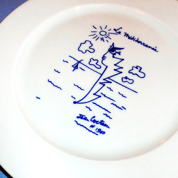 Photos : 1 : Assiette dessinée par Jean Cocteau - 2 : Les queues de langoustines dorées au Panko avec une sauce aigre-douce à la pulpe de poivron rouge - 3 : La soupe de poissons de roche et sauce rouille - 4 : La brioche perdu avec confiture de figues maison et glace faisselle de chèvre - 5 : La salle du restaurant.