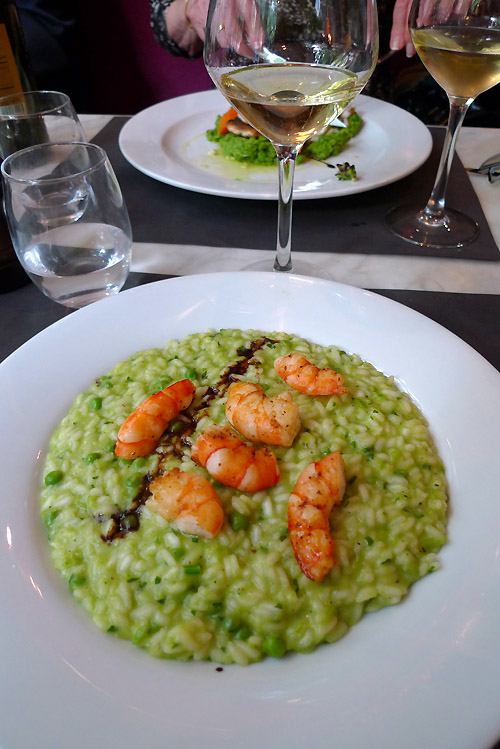 Photos : 1 : L'entrée du restaurant - 2 : La pizza à la boutargue et oignons nouveaux - 3 : Le risotto aux petits pois et gambas - 4 : Le semifreddo à la ricotta accompagnée d'une crème à l'orange - 5 : La salle du restaurant.