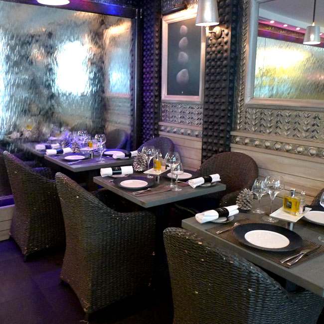 La décoration élégante de la salle, bois, coquillages, galets et cuirs est mise en valeur par un bon éclairage et un mobilier confortable.