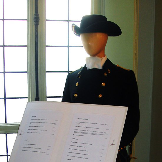 The Poulpry restaurant is open to the public and is a popular meeting place for former Poly students (who can take advantage of a special price menu) as well as artists, politicians and businessmen. There are four communicating dining room spaces, the main restaurant, Salon Bibliotheque, Salon Cour and Salon Diane, open depending on how many guests are expected. Each has an exclusive club atmosphere, with book lined walls and floor to ceiling silk curtains framing the French windows. Tables are dressed with starched white cloths and fresh flowers; porcelain plates are hand-painted with the Polytechniciens's signature tricorne hat, the silver shines and cut crystal glasses sparkle.