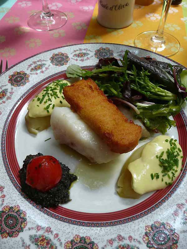 Photos : 1 : Un air de Provence - 2 : Le gâteau de tomates confites mozzarella - 3 : La morue demi-sel en citronette d'aïoli - 4 : Le nougat glacé au miel et coulis de fruit - 5 : Une salle du restaurant.