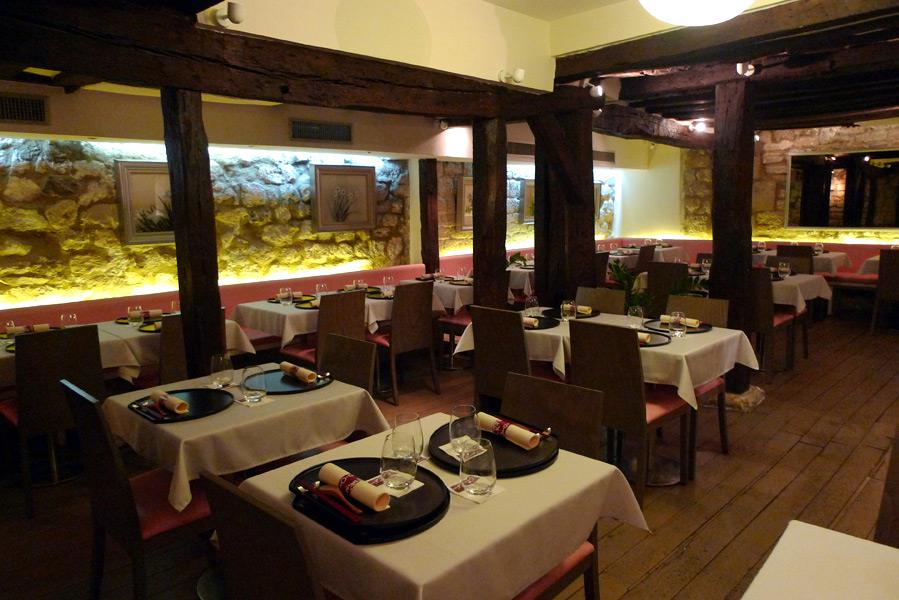 La décoration contemporaine lumineuse dès l'entrée avec son comptoir et dans les deux salles du restaurant où alternent murs de pierres avec poutres apparentes de style auberge ancienne et l'ambiance zen de la petite salle donnant sur la rue font de l'effet.