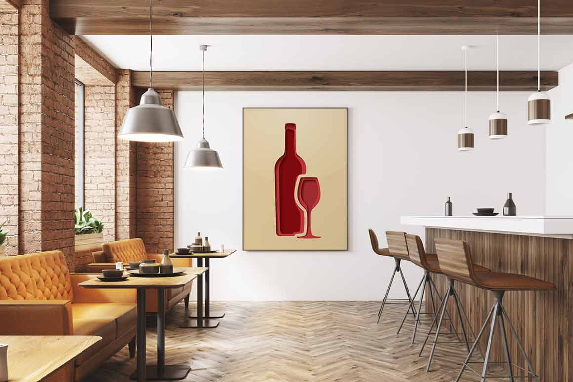 Dans un restaurant les accents décoratifs sont très importants. Lesquels ? Tout dépend de vos idées et de votre fantaisie. Les papiers peints (avec des motifs Art Déco ou Liquid Marble mentionnés précédemment) et les affiches vins de France parfaites pour mettre en valeur votre menu constituent les solutions les plus rapides et les plus efficaces pour