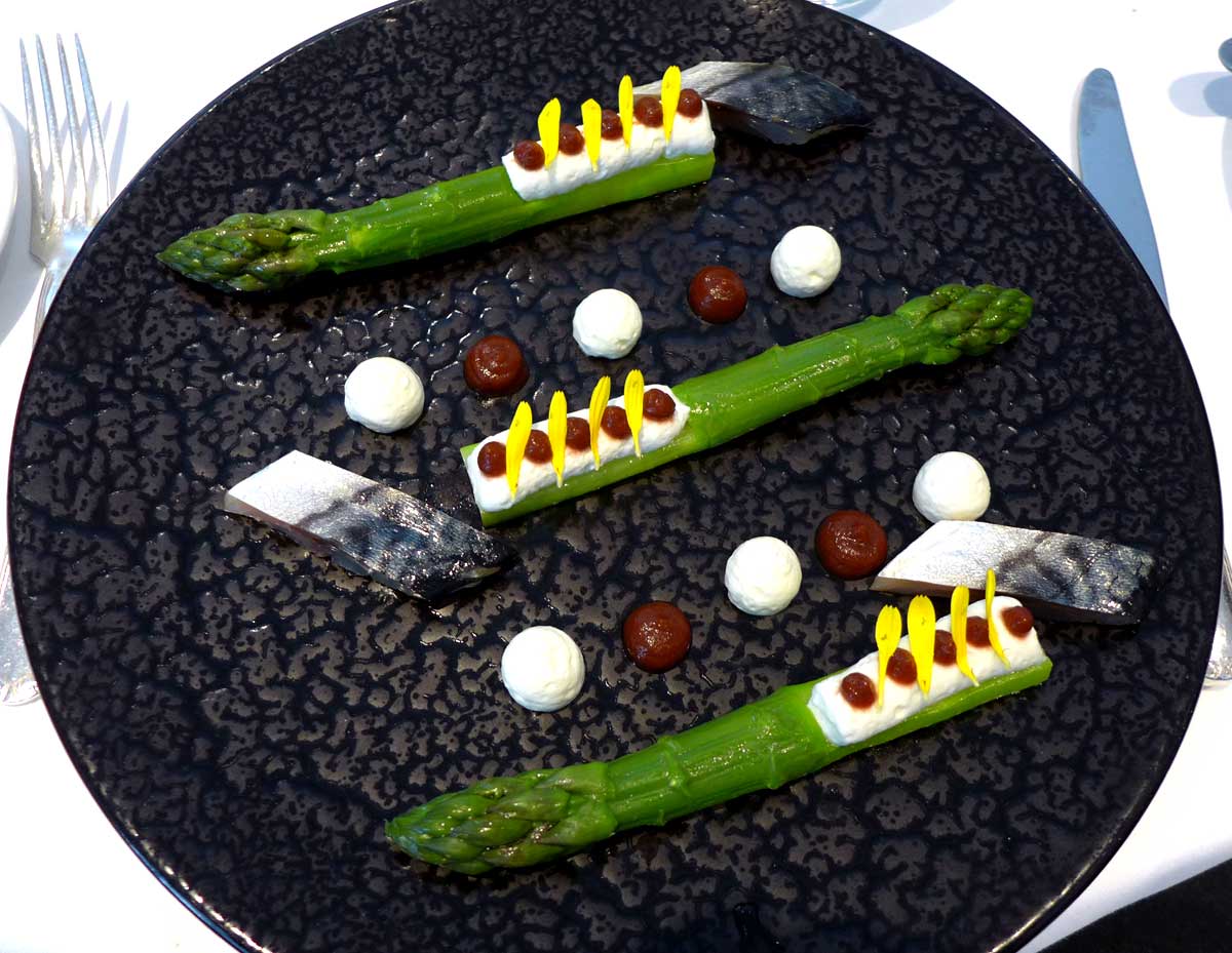 Photos : 1 : La salle du restaurant - 2 : Les asperges du Domaine de Roques Hautes, vinaigre balsamique de 30 ans, chèvre, betterave et gravelax de poisson - 3 : L'araignée de mer pomme verte, daikon, oeufs de harengs - 4 : Le Saint Pierre côtier, filet rôti, awabis, courgette, fenouil, citron vert, vierge de légumes au piment d'Espelette - 5 : La fraise des bois dans l'esprit d'un Saint Honoré, citron et basilic.