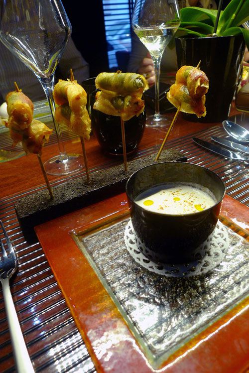 Acajou de Jean Imbert avec le tourteau et oeuf mollet, les langoustines crousti basilic tandoori parfumées et généreuses, le bio jaunes coques courgette curry, le foie gras haricots verts, le thon rouge avocat yuzu huile noix, la pêche d'Erquy du jour, le savoureux et fondant lard fermier agrumes lavande purée salade, ou l'épaule d'agneau risotto parmigiano bouillon gingembre.