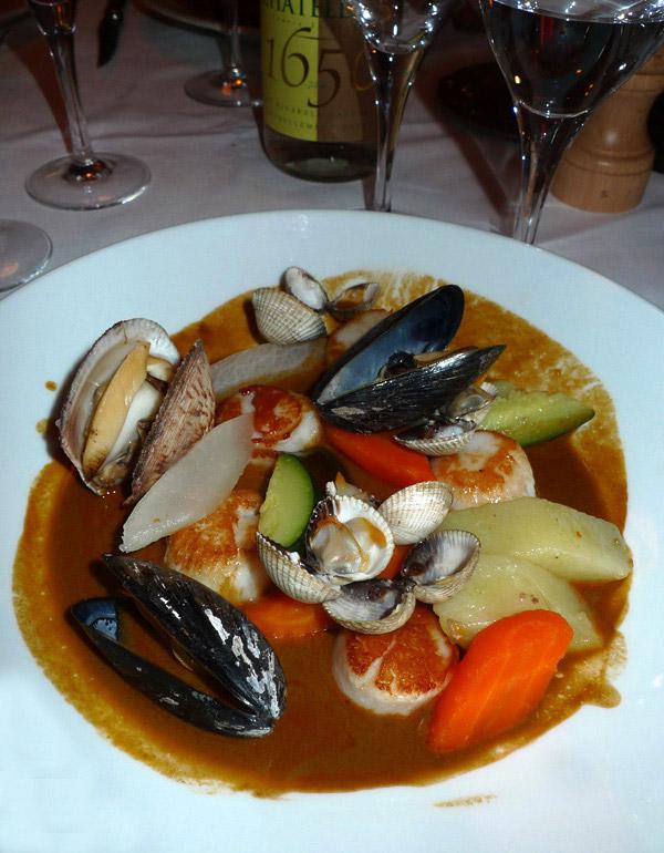 Photos : 1 : Décor classique et confort de la salle - 2 : Les noix de Saint-Jacques et fondue de poireaux - 3 : Le navarin de Saint-Jacques aux coquillages et sauce crustacés - 4 : Les crêpes Suzette au Grand-Marnier - 5 : La salle du restaurant.