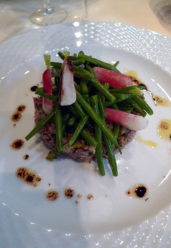 Photos : 1 : La salle du restaurant - 2 : La salade de queue de boeuf et haricots verts - 3 : Le cabillaud demi-sel et velouté d'herbes amères aux oeufs de saumon - 4 : Le minestrone d'ananas à la coriandre et gingembre espuma de noix de coco - 5 : Le décor de bistrot authentique.