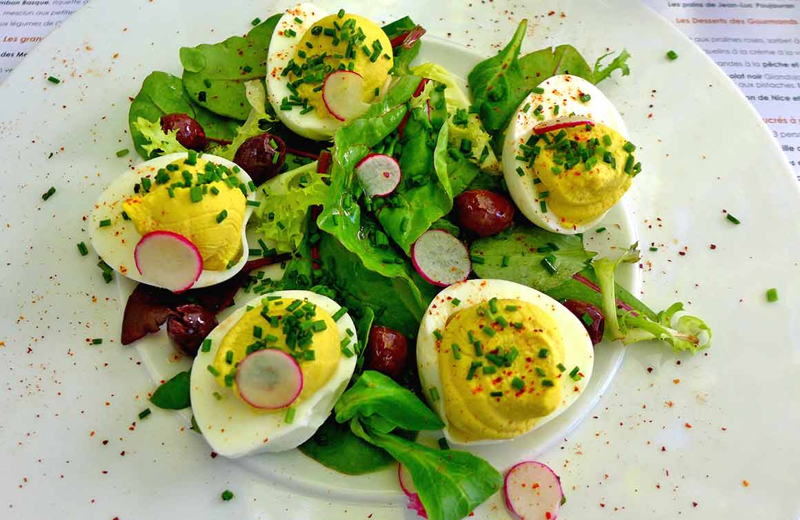 Selon la saison la carte annonce le Melon Charentais au Jambon Basque, riquette aux guindillas et aux noisettes ; les remarquables Oeufs durs bio mimosa, mesclun aux petites olives noire et aux amandes ; la Terrine de viande aux légumes ; le goûteux Tartare de Saumon élevé en Mer du Nord au pistou, avec citron vert, avocat, concombre, radis rose et amandes ; les Grandes salades composées ; les excellentes Grosses Crevettes roses de la Mer du Nord aux pâtes Kamut bio avec calamars au chorizo, aux pois gourmands et aux tomates cerise ; le Dos de Cabillaud de l’Atlantique Nord à la plancha et poêlée de légumes verts au pistou ; le Poulet fermier Label Rouge rôti au thym et pomme purée du Renard ; le Rognon de veau à la plancha, sauce à la moutarde de Meaux et jeunes légumes verts aux amandes ; ou la Belle Entrecôte de Bœuf à la plancha avec pommes frites au couteau, mesclun de salades.