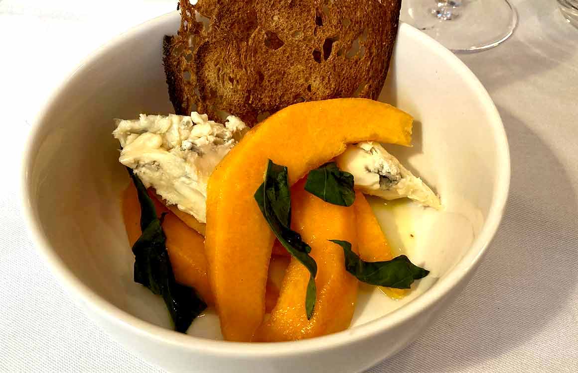 Pour le dessert, après le suave Gorgonzola avec melon et baslic, les plus gourmands se laissent tenter par la Pavlova aux fraises rafraîchie de sorbet pampleousse et poivre de Timut, la mousse au chocolat et brioche plus crème glacée cachuète, ou les abricots confits et amandes caramélisées plus glace au yaourt ardéchois.