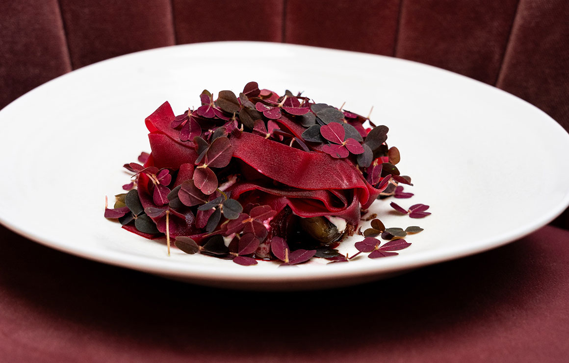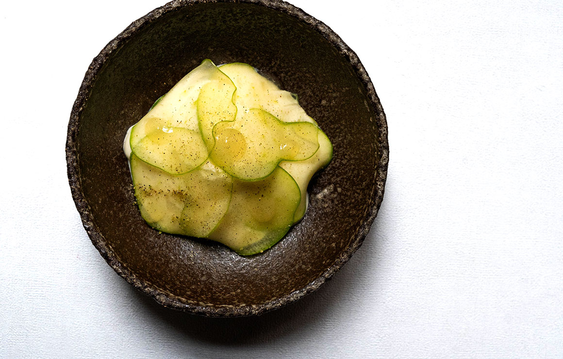 Les alliances de saveurs des entrées sont tout aussi audacieuses et succulentes : « Choux pointu glacé, pâte de citron confit, algue et laitue de mer, beurre blanc, huile d’aneth », « Moules fumées de Galice, condiments citronnés, émulsion marinée, éclats de noisettes du Piémont, crème de moule » (plat signature), « Millefeuille de pommes de terre, artichauts, épinards, crème d’ail fumée, jus végétal ».