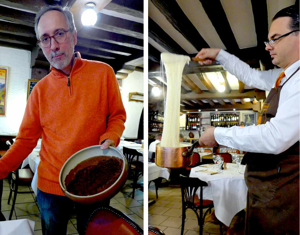 Photos : 1 : La salle du restaurant - 2 : La saucisse de Parlan et aligot - 3 : L'épaule d'Agneau Allaiton cuite 13h à basse température - 4 : Didier Desert et la jarre de mousse au chocolat - Le filage de l'aligot - 5 : La crêpe "Ginette" - le gâteau sucré.