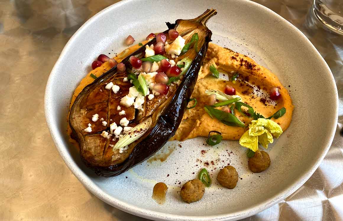 Pour le dessert, la Pêche rôtie au romarin, crumble, chantilly lavande, zeste de citon et combawa ; le Flan chocolat, confiture tomateverte et crème anglaise au ras El Hanout ; ou la pomme pochée, crémeux citron, basilic tropical et meringue.