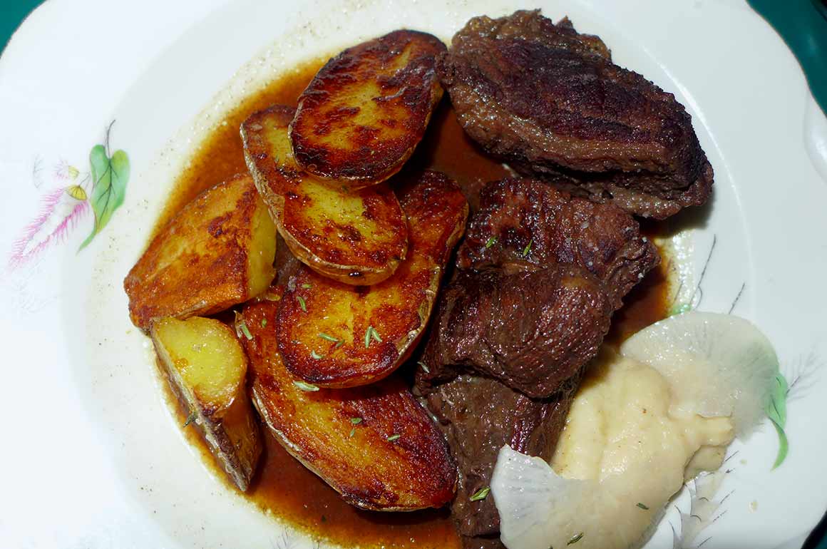 Puis Béatrice se délecte de l’étonnant « Coucou de Rennes, courge Jack Be Little, poireaux, salers, huile de noix » tandis que je savoure le goûteux « Bourguignon de bœuf Galloway, pommes de terre, navets » (tendreté de la viande, légumes fondants).