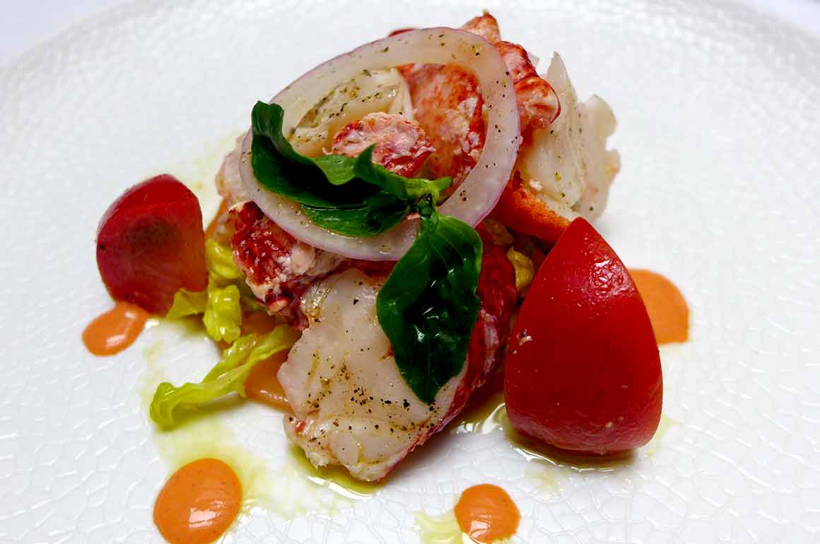 Antipasti : Langouste comme à Castelsardo avec tomates coeur de boeuf, oignons rouges, huile d’olive et citron ; ou Salade de fèves, pecorino, poutargue et gambas de Sant'Antioco ; suivis par les