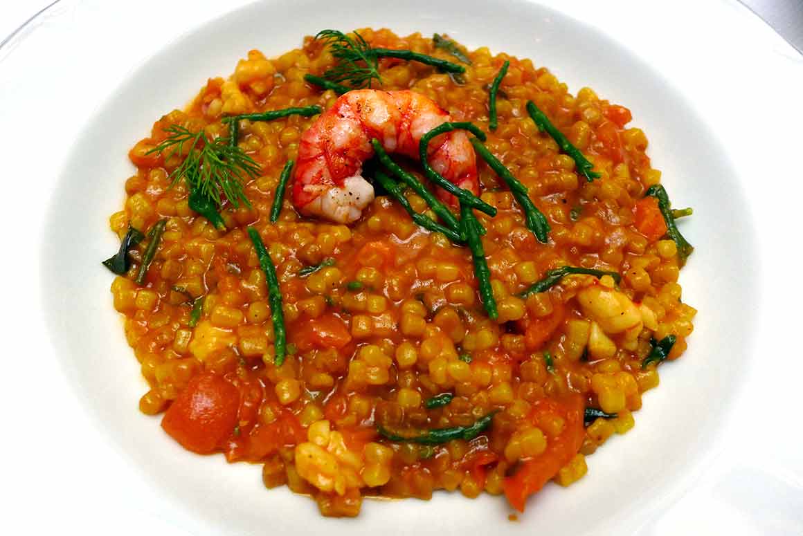 Primi Piatti ou Secondi : Fregula sarde au safran avec gambas, asperges de mer et pecorino ; ou Spaghetti aux langues d`oursins, courgettes fleur et huile de pistache sarde ; et pour les poissons, Rouget frit à la semoule avec thym, citron, pain "carasau", concassé de tomate camone et huile au basilic ; Filet de Saint Pierre gratiné au pecorino, asperges et huile au persil.