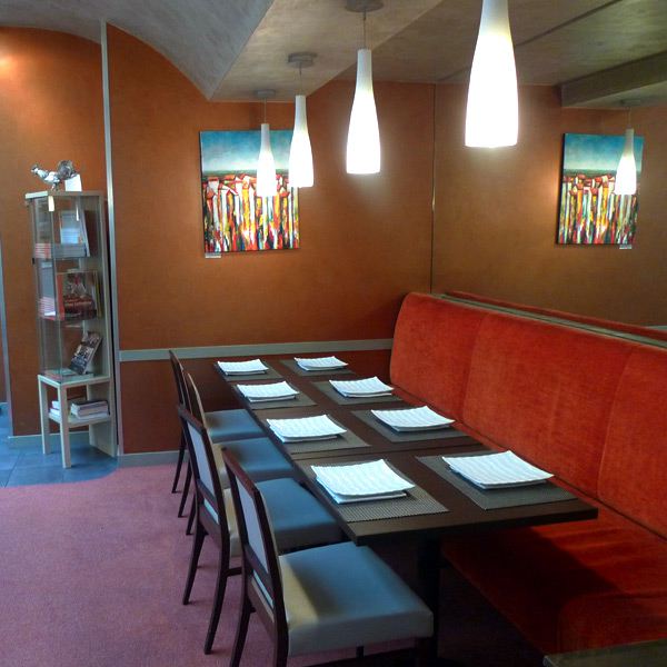 La décoration des 3 salles à manger est dans le style contemporain chic, avec des banquettes et des fauteuils confortables, des tableaux de peintures modernes aux murs et un mélange de couleurs pas toujours harmonieux.