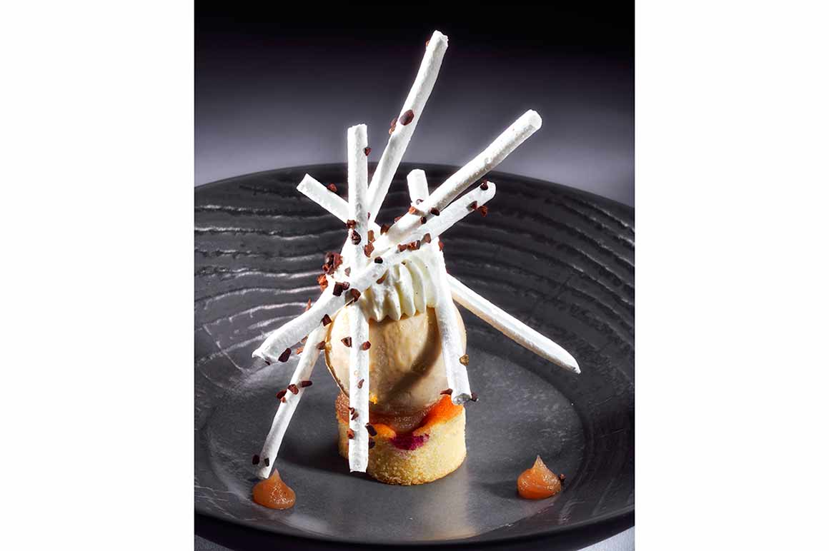 Le boeuf carotte confie un clin d’œil amusé. Le rouget, avec sa réduction de soupe de poissons épicée, écailles croquantes, sublime la méditerranée. La crème au Lagavulin 16 ans libère le pigeon à la truffe. Cette manière vivante et colorée, fondée sur une tradition et une intégrité, évite la rupture salé/sucré par le dialogue intergénérationnel. Le sorbet mandarine équilibre le croquant du zeste et l’acidité finale. «Je me dois de ne jamais trahir par une cuisine rassurante, un art de recevoir pour l’émotion des instants et des moments».