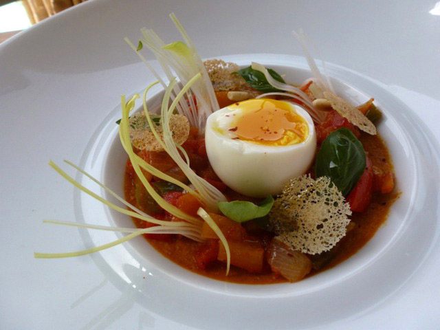 À goûter absolument un oeuf bio mollet et sa royale d'asperges, aux gouts du Maroc avec des produits du potager, un tartare de thon au couteau copeau de parmesan et basilique à l'huile d'argan pimentée, une dorade à la Chermoula de légumes, une soupe frappée de petits pois à la menthe, soupe d'artichauts, ravioles de foie gras risotto au safran façon paella, grosses gambas snackées, piperade au chorizo, saumon en croûte de sésame, volaille en tajine, et de nombreuses pâtisseries toutes plus inventives les unes que les autres, minestrone de pamplemousse aux fruits rouges, et thé vert, ananas poché à la vanille de madagascar, cupcake au chocolat, macaron Namaskar etc...