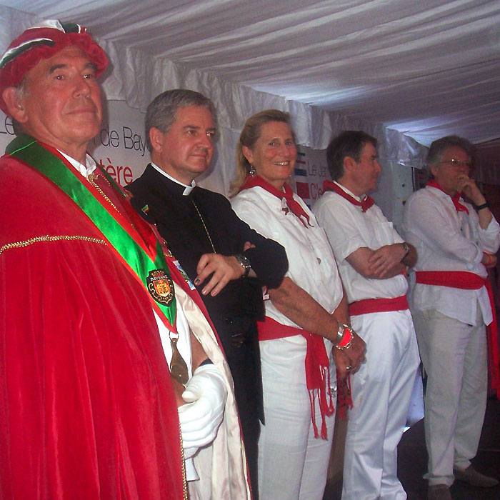 La marionnette du Roi Léon, qui veille attentivement sur ses ouailles durant toutes les fêtes. Ce personnage est inspiré d’une figure de la vie bayonnaise, Léon Dachary, réputé à l’époque pour ses frasques. C’est lui qui lance les fêtes en jetant, du balcon de la mairie, les fameuses clés de la ville, avec une personnalité invitée : Luis Mariano, Johnny Hallyday, Zazie, Bernard Lavilliers, certains membres de l’équipe des Girondins de Bordeaux ou des membres de l’Aviron bayonnais Rugby, y ont tous été de leur lancé ! Cette année c’est l’écrivain Frédéric Beigbeider qui avait la lourde charge d’envoyer les clés à une foule sur excitée. C’est à cette heure que votre serviteur fut intronisé, accompagnée de l’évêque de Bayonne et de Gilles Pudlowski journaliste gastronomique.
