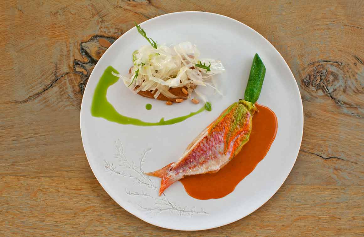 Dès les premières mises en bouche on ressent l’impact de son travail basé sur la fraîcheur, et les marchés de Provence chantés par Gilbert Bécaud. Les odeurs et le soleil du sud irradient chaque composition. Soupe au pistou parfumée au bouillon de coques servie froide, petits farcis de fleur de courgette au boudin blanc, tomates anciennes fumées au bois d’olivier, glacée au vinaigre de grenade, dans le choix des entrées, et Saint Pierre doré, anchoïade a l’ail noir, gnocchis de roquette, pièce d’agneau aux saveurs de pied paquet aubergine confite, etc. etc.