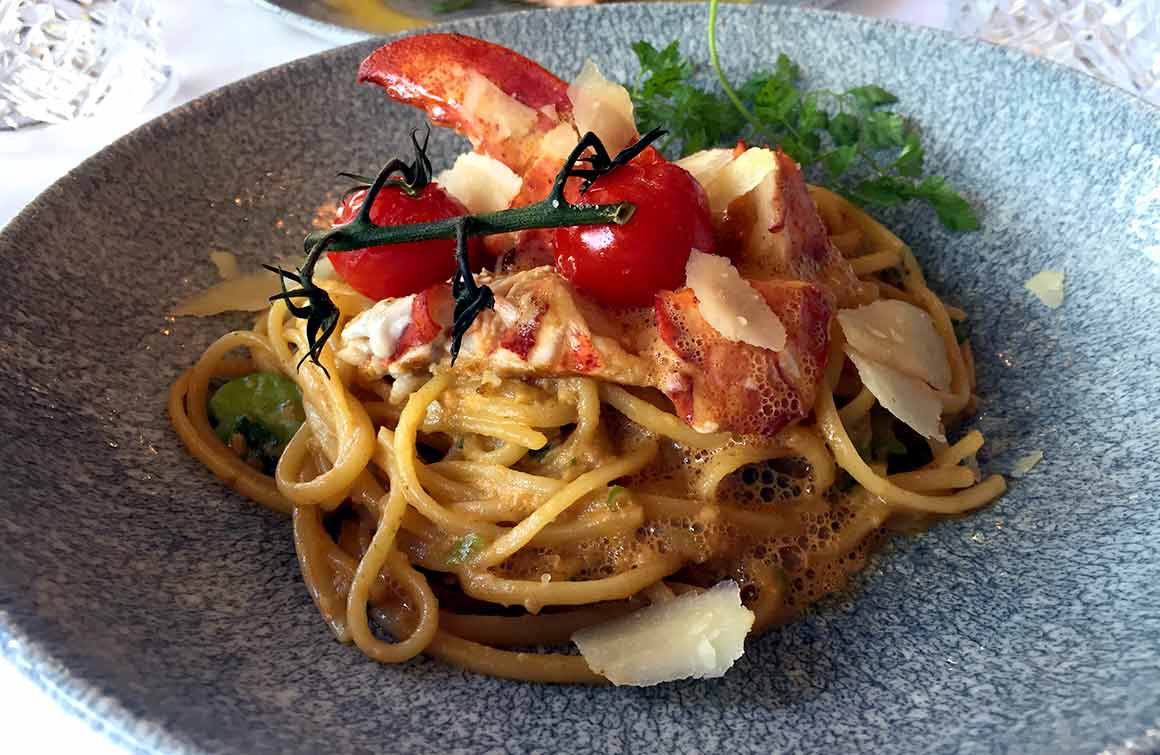 Photos : 1 : Entrée de La Lorraine - 2 : Fraîcheur de tourteau au citron vert - 3 : Coeur de saumon d'Ecosse grillé beurre blanc au safran - 4 : Linguines au homard - 5 : Huîtres et crustacés.
