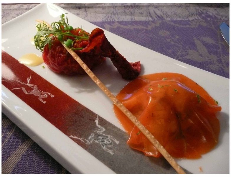 Pour les plats, on se régale aussi avec le rôti de lotte roquette et mimolette ; le Bar de ligne à 55°, mortadelle à la pistache et pressé d’endives au sirop d’érable ; le canard sauvage et foie gras poêlé Miso-Muscadet, pommes de terre en purée tourbée et abricot sec acidulé ; le veau de lait, émulsion betterave, genièvre et choux grillé ; ou le filet de barbue aux poivres rares et fines ravioles de mangue avec crevettes au basilic