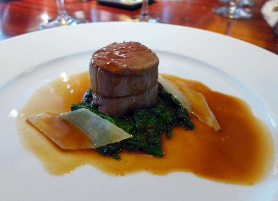 Ensuite, pour les plats, un superbe bar de ligne confit dans une nage de pastis et minestrone de légumes du printemps à la cuisson parfaite et aux goûts délicats, suivi par un tendre et fondant filet de veau du Limousin avec vert et blanc de blette glacé et jus réduit au pastis, un plat aussi séduisant que raffiné.