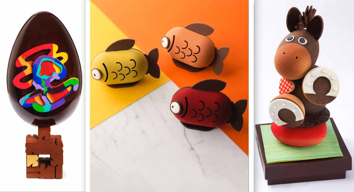 Cette année Cyril Lignac et Benoît Couvrand ont troqué les traditionnels lapins contre des poissons, clin d’oeil au 1er avril farceur - la Collection est complétée par les oeufs de Pâques signatures